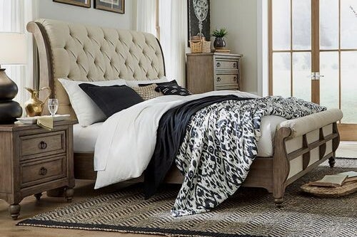 When details matter, choose the Americana Farmhouse. Crafted of poplar solids with white oak veneers, this bed features a wire brushed dusty taupe finish with worm hole distressing. The headboard and footboard feature a button tufted upholstered linen rolled top panel, framed by shaped solid wood pilasters with nail heads accenting the frame of the upholstery. The footboard has an exposed frame to create a deconstructed feel. With the bolt-on rails and center support slat system, this bed is sure to last. Americana Farmhouse evokes a style unconstrained and intended to be personal with an authentic craftsman’s flair and artistry.