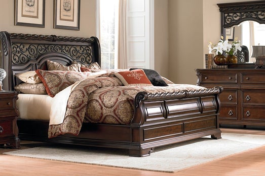 Opt for an elegant display. A refined yet relaxed feel describes the Arbor Place. Crafted of poplar solids, birch veneers and metal, this kit features a brownstone finish, four-way match fancy face veneer tops, canted corners and shaped pilasters, a hidden drawer, full extension drawers with felt lined top drawers, scrolled bracket feet, and is accented with a custom designed drop ring and knob hardware. This sleigh bed features rope twist cap rails on the headboard and footboard. The headboard also has scrolled inserts finished in a burnished brass metal. The dresser has eight drawers, including the two hidden drawers. The landscape mirror features a beveled edge and has scrolled metal inserts to match the headboard and can be attached to the dresser using the included bolt-on supports. The chest offers six drawers of storage, with two drawers having bluff-cut drawer fronts giving the illusion of multiple smaller drawers, while still offering deep storage. Arbor Place bridges a combination of bold and dramatic scaling with soft shapes creating a casual, traditional style.