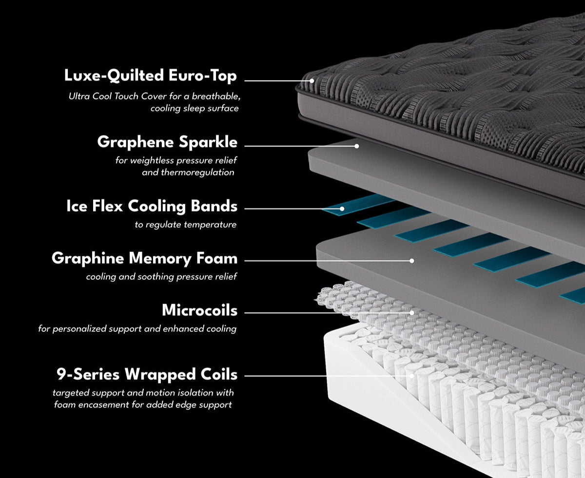 The most luxurious and upgraded design, featuring a hypersoft quilt foam Euro topper for added cushioning, pressure relief, and responsive surface feel. This bed also provides superior cooling benefits with its innovative Ice Flex Cooling Bands that provide over 12 hours of advanced temperature regulation. Premium foam layers and Coil Support System with Microcoils (Plush model only) provide the perfect balance of support and cushioning. This mattress is great for sleepers who enjoy a soft, luxury feel and added comfort layers but want the underlyng support of a firmer core.