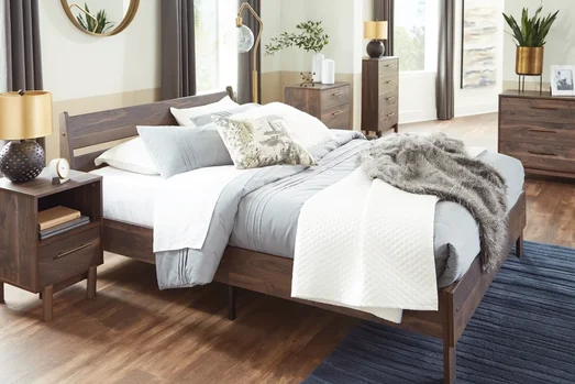 At the intersection of classic cool and chic sophistication you’ll find the Calverson queen panel platform bed. The rich brown finish over replicated walnut wood grain offers an authentic touch that plays well any way you style it. Minimal yet elegant in its design, this bed keeps your home decor grounded while elevating your modern style.