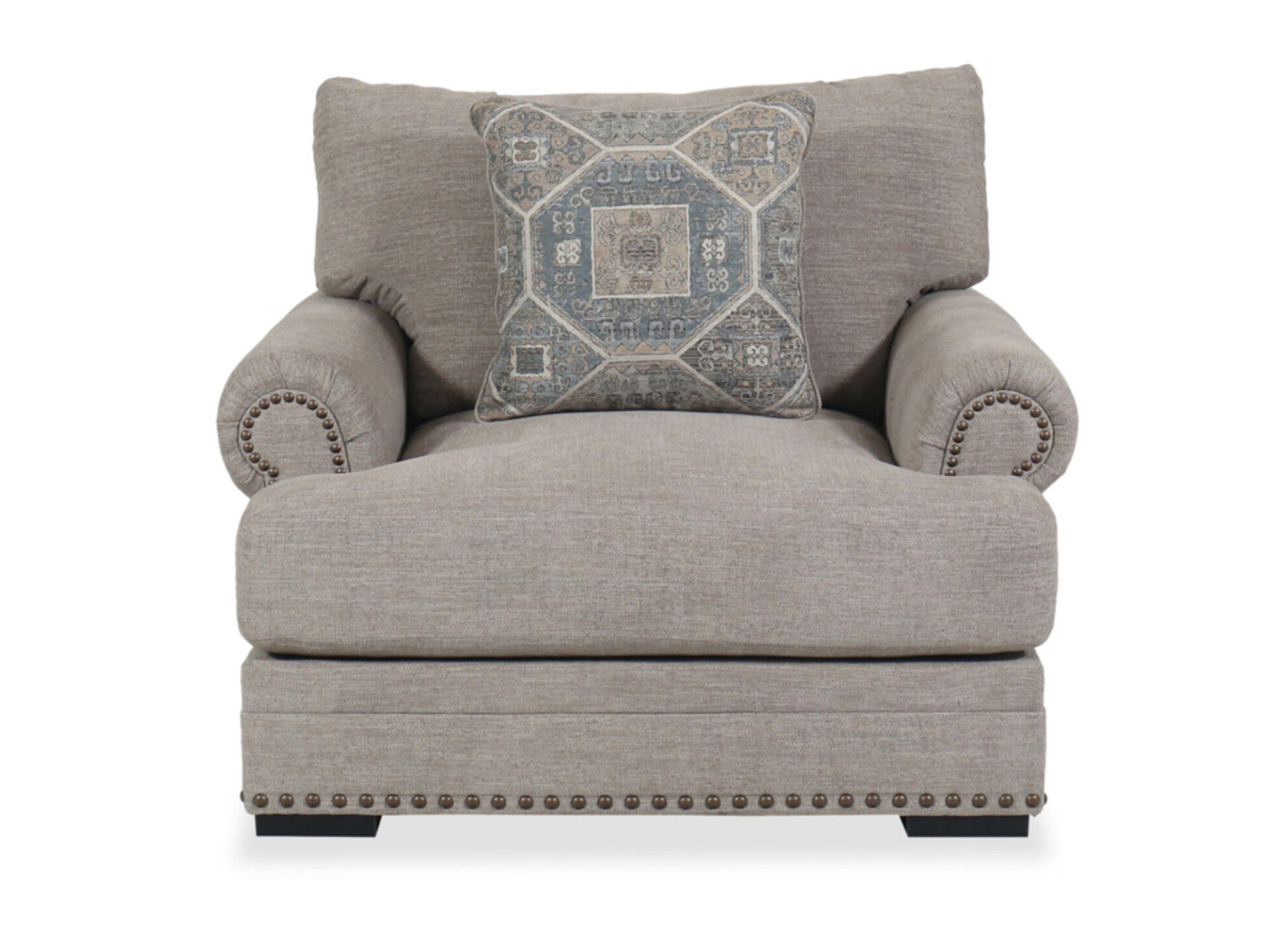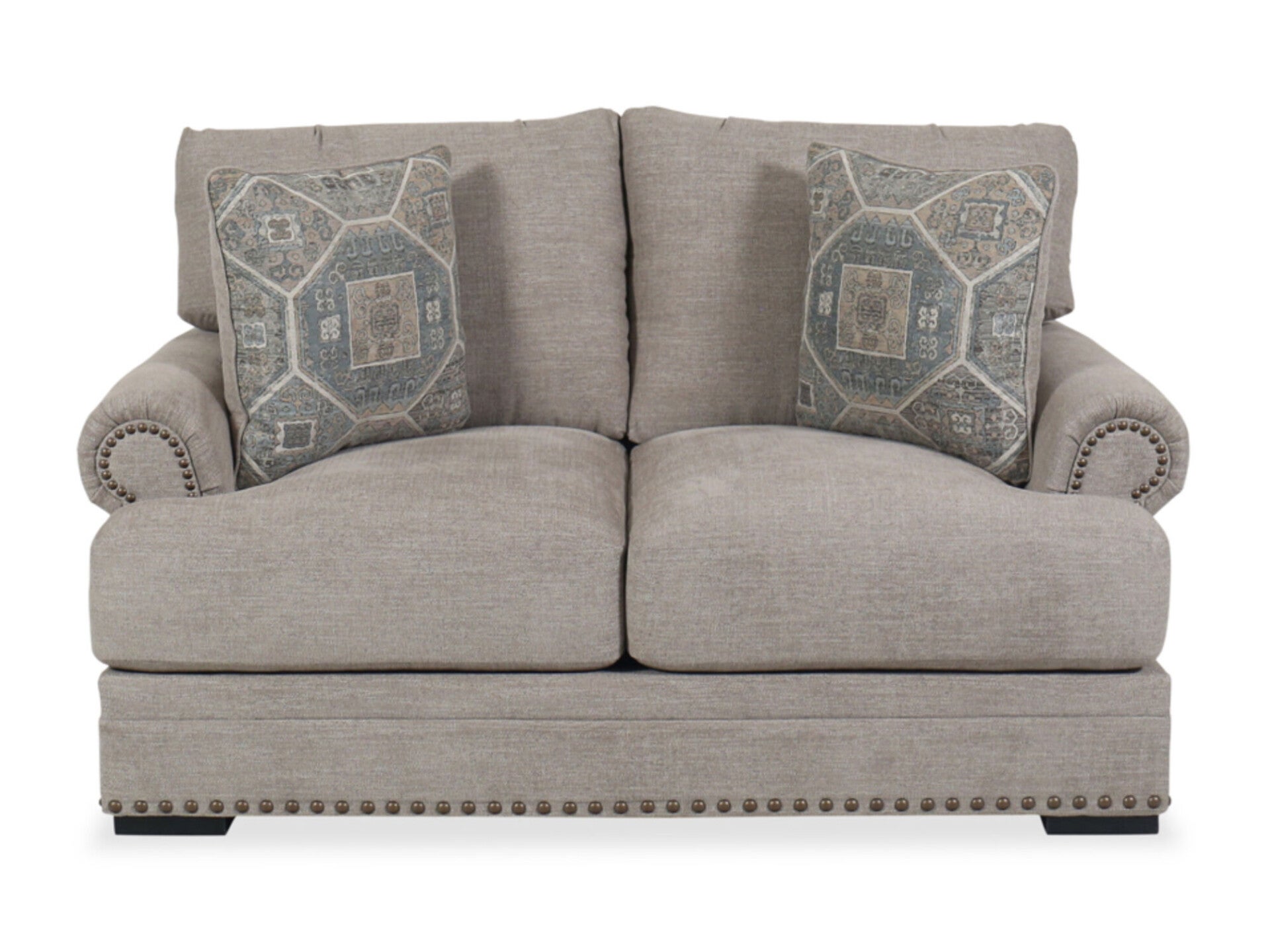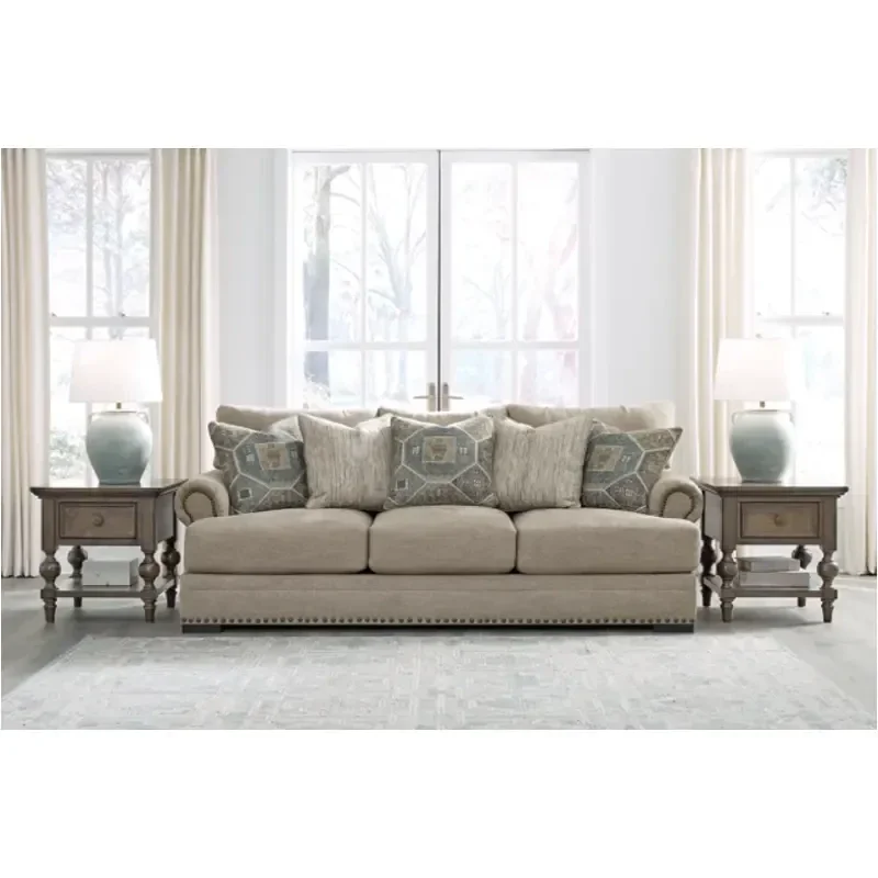 Indulge in classic elegance with the Galemore series. This traditional series boasts a charming silhouette that invites relaxation. Its loose back and seat cushions provide comfort, while the roll arms add a touch of classic sophistication. Wrapped in luxurious beige fabric upholstery, it radiates warmth and versatility. Delicate nail head trims accentuate its refined design, offering a hint of glamour. Complete with a plush throw pillow, this sofa is the perfect centerpiece for cozy gatherings or quiet evenings.