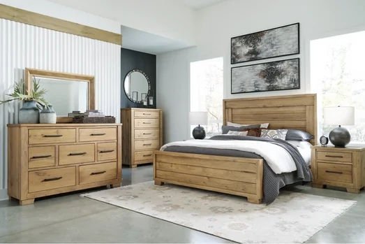 The Galliden bedroom expertly refines the raw beauty of wood, bringing a rustic vibe to urban contemporary design. Natural details on the wood, unique to each piece, create an organically beautiful feel in your bedroom. And the stunning simplicity of the materials allows you to seamlessly coordinate this set with your existing decor.