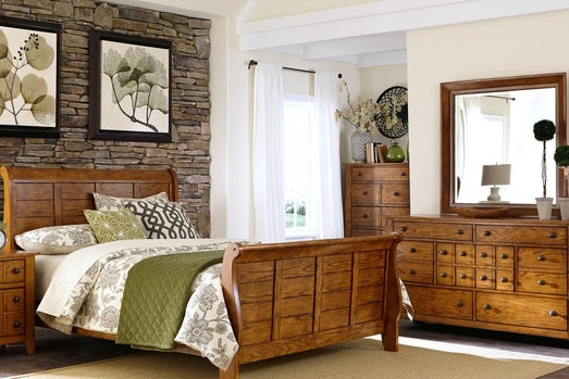 Staple any room with this rustic American style bed. Constructed with select hardwoods and ash and oak veneers, this piece features an aged oak finish, center slat supports, and a bolt on rail system. With wood and peg accents, this bed is sure to bring uniqueness and functionality to any room, allowing for a craftsman feel.