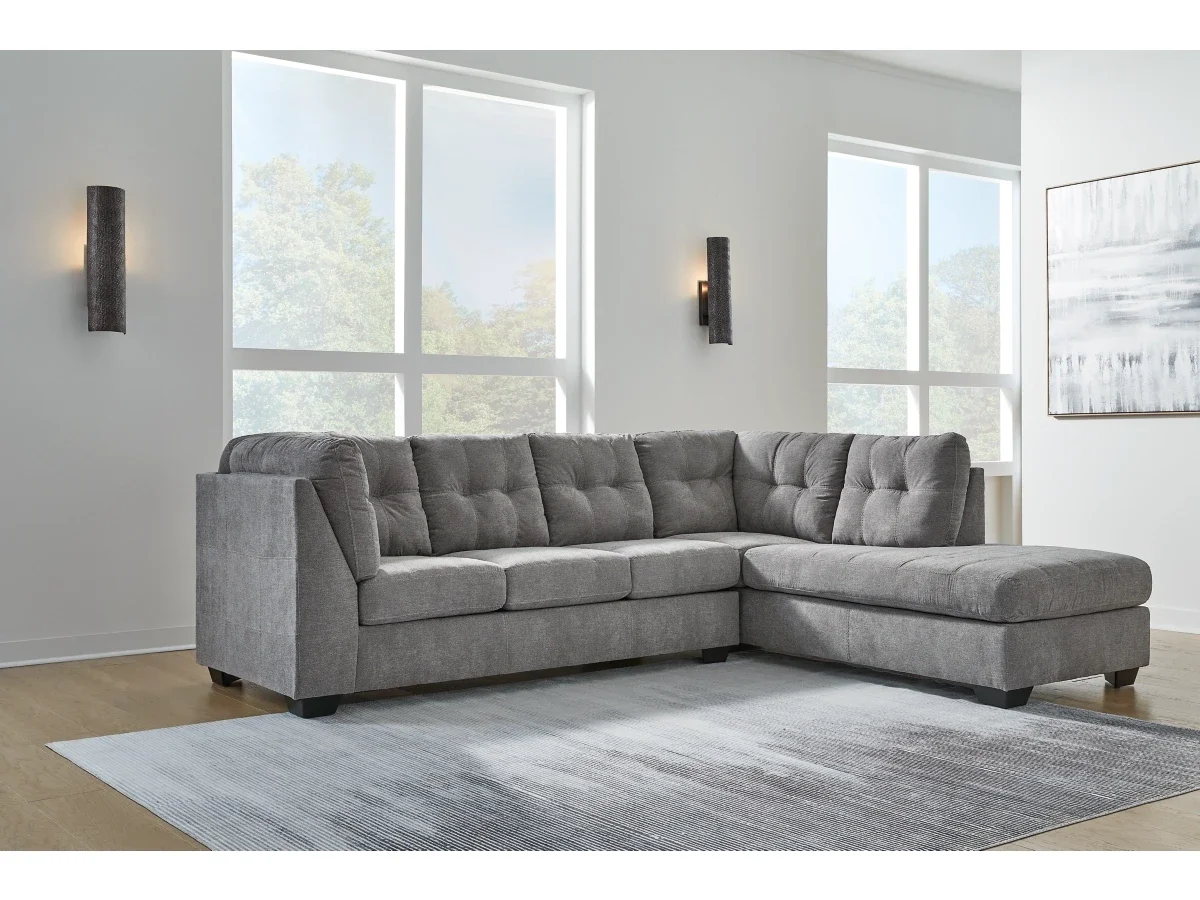 The Marleton sectional with chaise takes a homey approach to high style. Its gray coloration has classic versatility, while a contemporary silhouette and stitched details keep the look totally on trend. And you can count on comfort—the chaise invites you to kick back and stretch out.